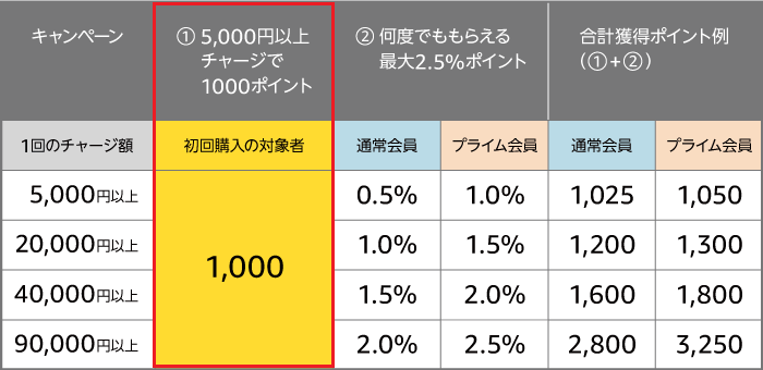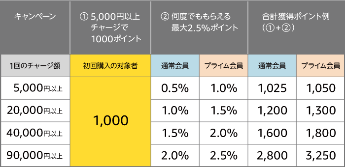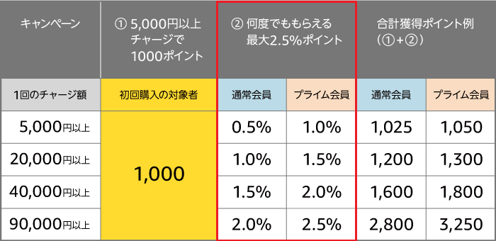 キャンペーン②:チャージするたび最大2.5%ポイントが貯まる